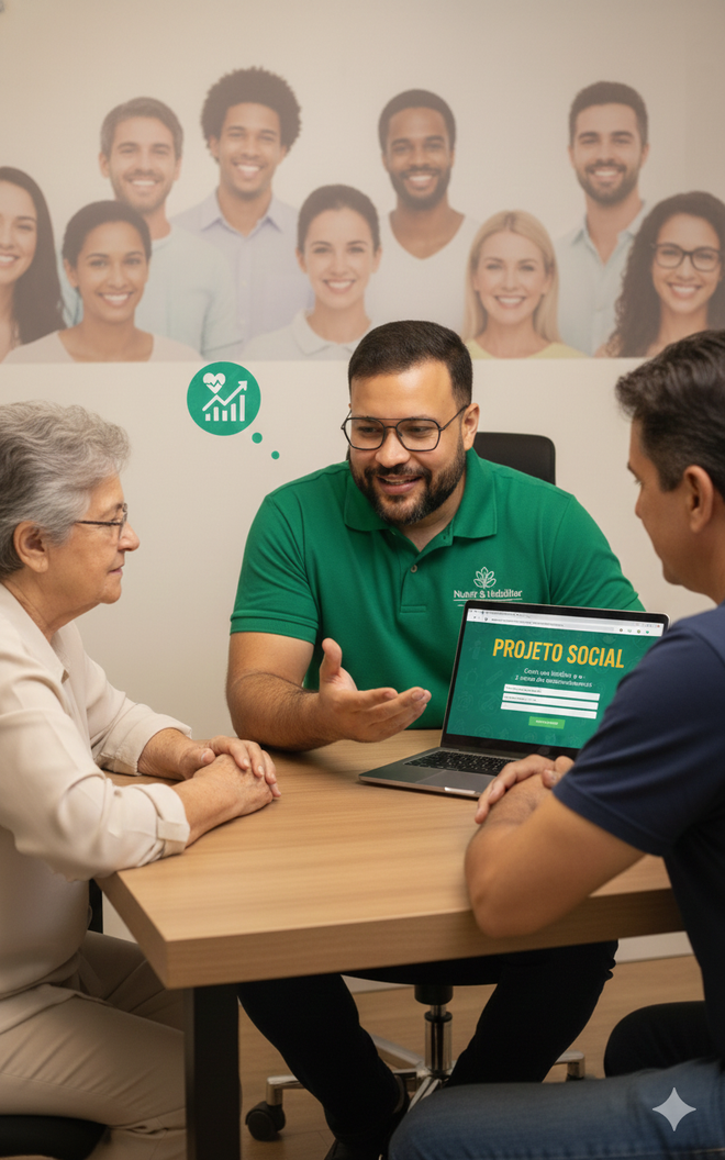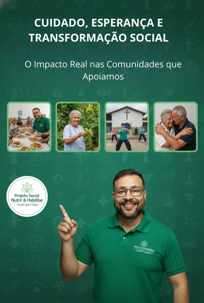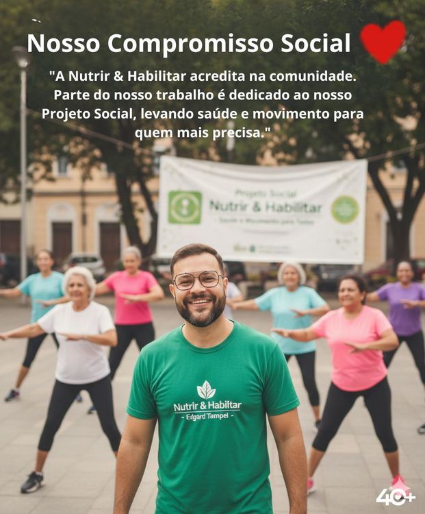 Acreditamos que saúde e qualidade de vida não devem ser privilégio apenas de quem pode pagar. Por isso, realizo o Projeto Social NUTRIR & HABILITAR, que oferece atendimento gratuito por 3 meses para seis pessoas por mês, priorizando idosos e pessoas acima de 40 anos em situação de vulnerabilidade social, com foco em nutrição, movimento e recuperação de autonomia.
